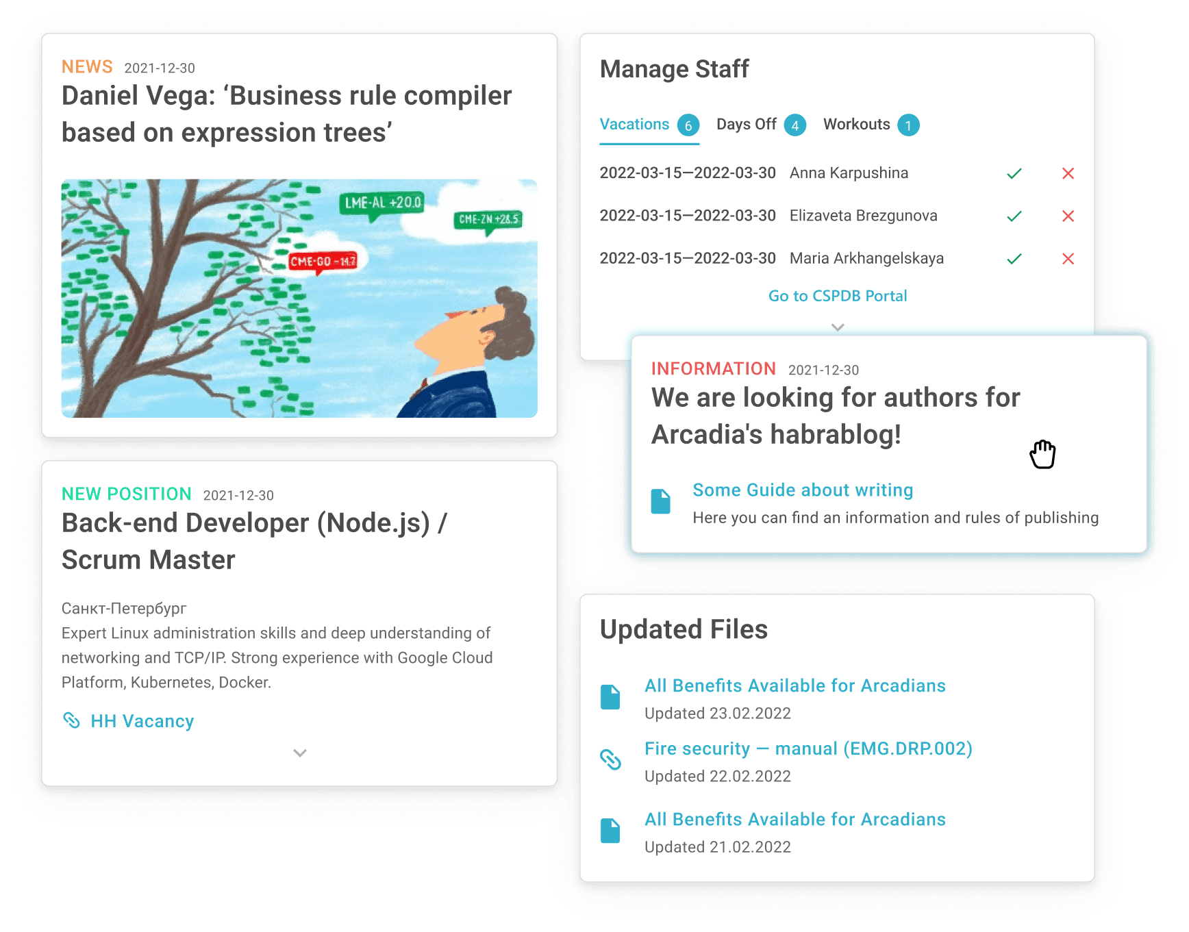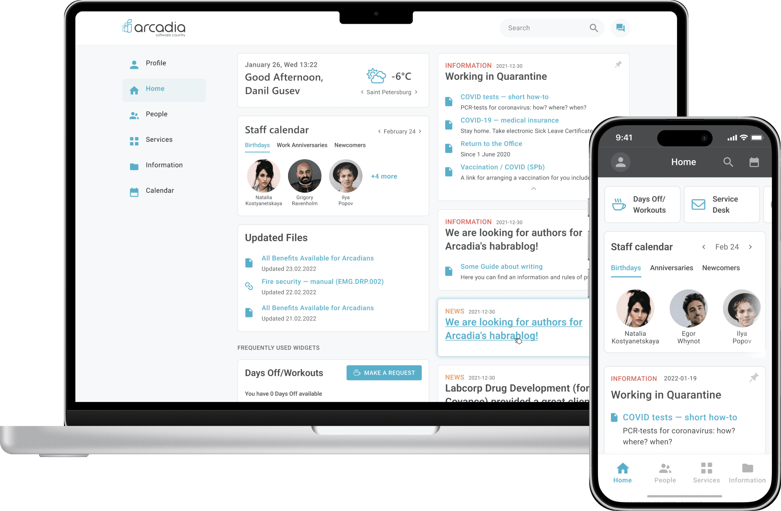 Arcadia Intra is an internal corporate portal designed for Arcadia Inc. The goal of the project was to overhaul the portal’s design to reflect the company’s updated business processes and modernize the visual identity, all while accommodating the diverse needs of regular employees, managers, and administrators.